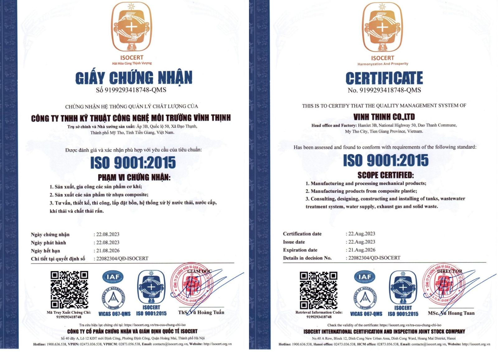 ** Bằng sự chuyên nghiệp trong mọi hoạt động, ngày 22/8/2023, CÔNG TY TNHH KỸ THUẬT CÔNG NGHỆ MÔI TRƯỜNG VĨNH THỊNH đã chính thức được CÔNG TY CỔ PHẦN CHỨNG NHẬN VÀ GIÁM ĐỊNH QUỐC TẾ ISOCERT cấp giấy chứng nhận đạt tiêu chuẩn ISO 9001:2015 cho các lĩnh vực hoạt động như: